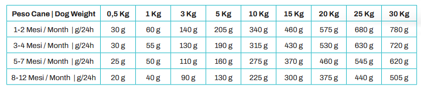 Proteina grezza 29,00%, Grassi grezzi 16,00%, Fibra grezza 3,00%, Ceneri grezze 8,50%, Calcio 1,80%, Fosforo 1,20%. E.M. 3948 Kcal/kg - 16,53 MJ/Kg. ADDITIVI -