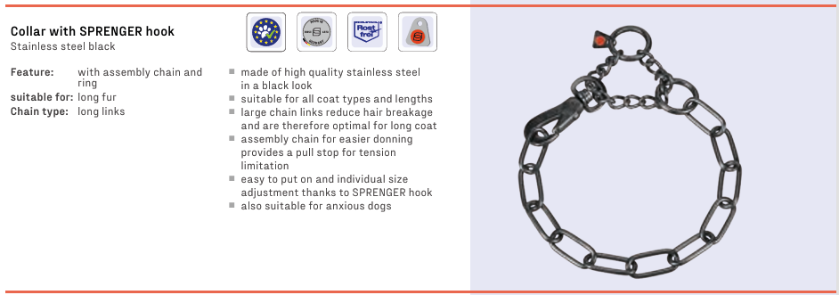 Il materiale robusto resiste al vento e alle intemperie durante lunghe passeggiate e sessioni di addestramento ed è ideale anche per gli amanti dell'acqua. Grazie al gancio SPRENGER, la catena è molto facile da indossare e può essere regolata individualmente, adattandosi anche ai cani in crescita.