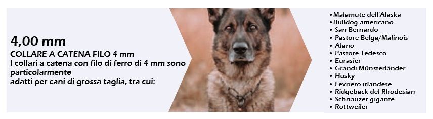 I collari a catena con spessore di 4 mm sono particolarmente adatti ai cani di taglia grande, tra cui: