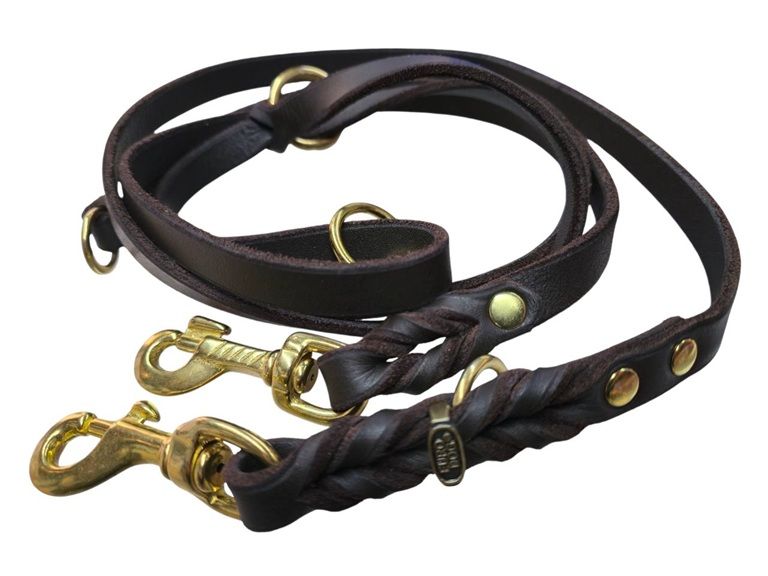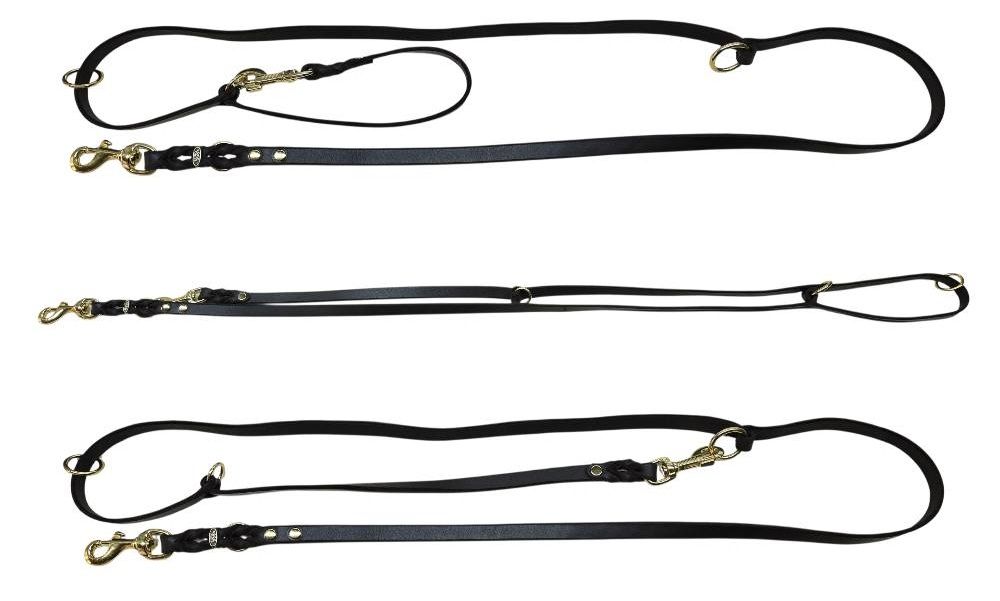 Presentiamo alla vostra attenzione un nuovo guinzaglio allungabile da addestramento. Questo accessorio è molto comodo perché permette di regolare la lunghezza. Il guinzaglio è dotato di due moschettoni in ottone, due anelli fissi e un anello scorrevole che lo rendono molto comodo e facile nell'uso. Agganciando i moschettoni per i diversi anelli si può modificare la lunghezza e la funzionalità del guinzaglio. Nel primo caso si tratta di un guinzaglio solito con maniglia. Ma se agganciato con un anello scorrevole, voi avete un guinzaglio della lunghezza media che potete usare durante l'addestramento o le passeggiate. Fissando il guinzaglio con un terzo anello voi avete un nuovo modello. Mettendo il guinzaglio attraverso la spalla, potete liberare le mani e allo stesso tempo il cane cammina vicino a voi. Questo guinzaglio è uno dei più popolari nel nostro negozio.Guinzaglio versatile allungabile in pelle per cane