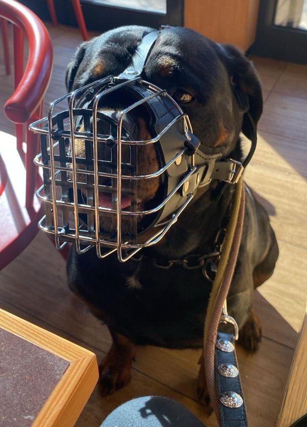 Muso appositamente preparato per cani Rottweiler a causa della costruzione della testa. Realizzato in metallo cromato fili e cinghie di cuoio fissati nella parte posteriore della testa. Le aree di contatto della museruola con il muso del cane sono imbottite di feltro. Il suo vantaggio è la durata e la facilità di manutenzione. Una museruola metallica ben aderente consente al cane di vagare e bere acqua, offrendo un grande comfort. Realizzato a mano con alta precisione per garantire comfort e sicurezza per il cane.